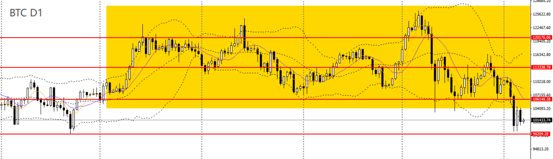 比特币昨日收长阴柱,日线关口邻近,如再度失守,后市估计将回踩98000,94000。