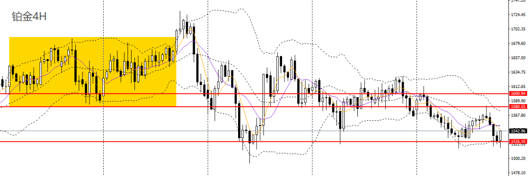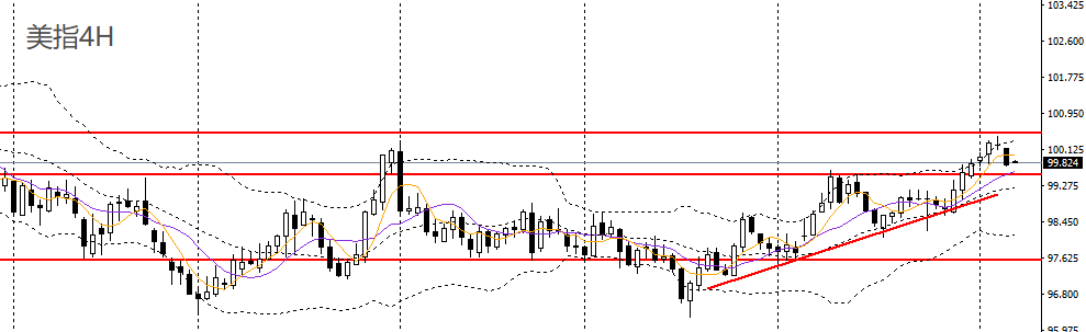 美元指数周四收跌,4小时接连阴跌,触及要害支撑99.70,短线走势疲软,后市有望持续下探99.50,99-99.20。