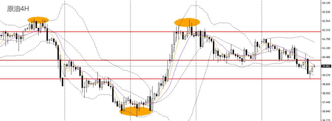 美原油昨日收十字阴线邻近承压可持续进空,后市估计仍将下探58.50-59。
